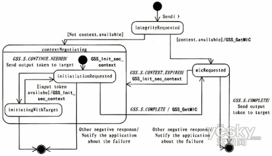 下面說明如何利用GSS-API實(shí)現(xiàn)保證通信完整性的安全能力抽象類,通過狀態(tài)圖說明保證通信完整性的Sender類的send()方法及Receiver類的receive()方法的GSS-API實(shí)現(xiàn)。本文中給出的是一個示意性的說明,忽略了一些錯誤處理過程。