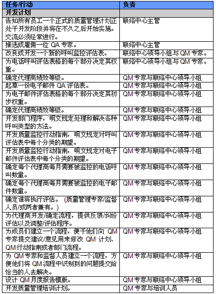 4. 開展項(xiàng)目交流。管理人員必須就新的或者修繕后的QM計(jì)劃與代理商進(jìn)行交流。QM的成功與否與代理商的合作密不可分,如果代理商受邀參與新QM計(jì)劃的開發(fā)并且所有改變都在雙方之間明確交流過,那么成功的機(jī)會(huì)也將大大提高。交流的內(nèi)容應(yīng)包括為什么要開發(fā)這樣一個(gè)計(jì)劃,它的作用和職責(zé)是什么,它對代理商會(huì)產(chǎn)生哪些影響(對于他們的評估和提升)以及它能帶來哪些好處。幫助代理商認(rèn)識(shí)到QM計(jì)劃積極的一面很重要,因?yàn)橹挥羞@樣才能讓他們看到QM不僅僅是管理人員用來告訴他們做錯(cuò)了事情的一種手段。讓聯(lián)絡(luò)中心全體員工參與QM計(jì)劃的開發(fā)能夠建立他們對該計(jì)劃的支持,提高接受度的同時(shí)避免不知所措。這對聯(lián)絡(luò)中心剛剛嶄露頭角,QM計(jì)劃還未全面鋪開的中國市場而言尤為重要。