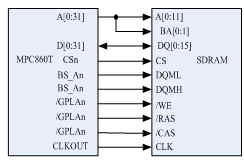 SDRAM的CLK信號由MPC860T的輸出時鐘CLKOUT驅(qū)動,/WE、/RAS和/CAS信號分別由UPMA的GPLA1~GPLA3產(chǎn)生。SDRAM的A10引腳要復用于SDRAM的刷新控制,因而必須與GPLAO相連(由于不方便連線圖中未畫出),因為MPC860T的GPLAO可以通過編程實現(xiàn)控制信號與地址信號的復用。MT48LC4M16A2內(nèi)部有12條行地址和8條列地址,行地址為高位地址,列地址為低位地址,而外部僅有12條地址信號A0~A11。這就需要對UPM對地址進行復用。MPC860T支持內(nèi)部地址復用,可以通過UPM的RAM字中的AMX位進行配置,同時將OR寄存器中的SAM位同時進行配置。相關寄存器配置為:BR2=Ox0000081,說明:32位寬,無奇偶校驗,無寫保護,選擇UPMA,基地址00000000;OR2=OxFF000A00,說明:16Mbyte容量,地址復用。