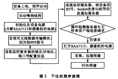 下位機軟件通過驅(qū)動程序提供的接口,在遠程圖像監(jiān)控設(shè)備中完成硬件的初始化、控制等功能,同時又負責(zé)圖像的壓縮和傳輸。它是所有設(shè)備的控制中樞,因此這里著重描述下位機軟件的工作流程,如圖5所示。