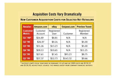 上世紀(jì)90年代末期DOT.COM就遭遇了這一嚴(yán)峻問題。70% - 80%的客戶在沒有完成采購之前就棄網(wǎng)站而去。對于許多人來說這被認(rèn)為是一個“行業(yè)基準(zhǔn)”,屬于可接受水平,但也有些人開始尋找解決方案。整個行業(yè)開始注意到分析家們的忠告:這一水平的放棄率是不被允許的。下面這張由Yankee集團在2000年發(fā)布的表格向我們展示了電子商務(wù)企業(yè)客戶獲取成本螺旋形盤升的過程。