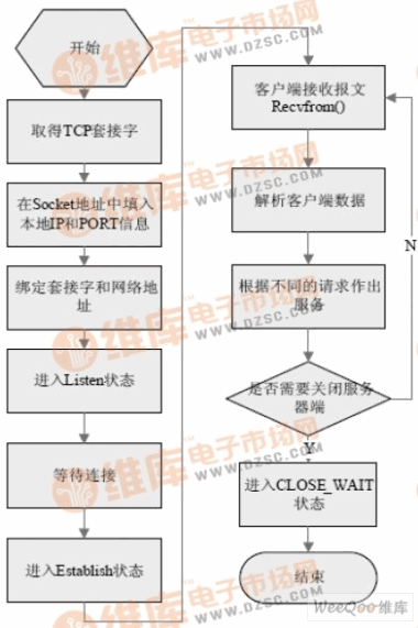 處理抽象。本應(yīng)用中需要派生一個QTcp 類,實現(xiàn)傳輸層的TCP 協(xié)議。一般基于 TCP 的網(wǎng)絡(luò)應(yīng)用程序都要繼承QTcp 類,然后在ESTABLISHED 狀態(tài)中添加 子狀態(tài)完成特定的功能。在服務(wù)器端,利用量子框架實現(xiàn)一個QServer 類,是一個活動對象,繼承自QTcp 類。QServer 活動對象同客戶端TCP Socket 連接后,進入ESTABLISHED狀態(tài)中,通過調(diào)用Recvfrom 函數(shù)接收客戶端的請求,然后解析請求的服務(wù)類型,根據(jù)不同請求做出不同的服務(wù)。其軟件流程圖如圖1 所示: