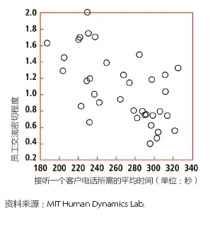 去年,彭特蘭的實(shí)驗(yàn)室與美國銀行(Bank of America)設(shè)在羅得島(Rhode Island)的呼叫中心合作,在80 名中心員工身上安裝了社會傳感器。這種傳感器看起來像一枚不顯眼的徽章,使用藍(lán)牙和紅外信號監(jiān)測實(shí)驗(yàn)對象每分鐘與哪些同事交談。測試活動先開展了一個月,后來又進(jìn)行了6周。第一個月后,實(shí)驗(yàn)室的研究人員發(fā)現(xiàn),與更多同事進(jìn)行過交談的員工能夠更快地接通電話,他們自我感覺的壓力也相對較小,而客戶滿意度卻與其他人一樣高。與刻板地遵循員工手冊或服從經(jīng)理的電子郵件指示相比,通過非正式的閑聊來交流問題和解決方案似乎能取得更好的結(jié)果。有了這種結(jié)論之后,該呼叫中心嘗試盡量將員工的休息時間安排在一起,而非像過去那樣錯開。這樣員工就有了更多的時間參與閑聊。幾個月后,美國銀行向?qū)嶒?yàn)室報(bào)告了結(jié)果:該呼叫中心獲得了相當(dāng)于每年1,500 萬美元的生產(chǎn)力提升。