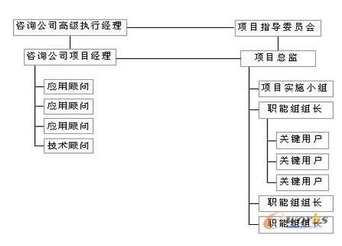 這支隊(duì)伍既有企業(yè)高級管理層所組成的指導(dǎo)委員會和咨詢公司人員,也有來自信息部門的技術(shù)人員和相應(yīng)職能部門的熟悉企業(yè)流程的業(yè)務(wù)人員所組成的實(shí)施小組和職能小組。項(xiàng)目隊(duì)伍組織結(jié)構(gòu)如圖所示