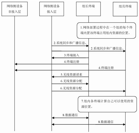 (6)網(wǎng)絡(luò)側(cè)設(shè)備接入層向組長(zhǎng)終端發(fā)布分配給該終端組的無線資源。