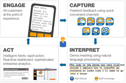 該應(yīng)用軟件能夠捕捉所有聯(lián)絡(luò)渠道上任何形式的客戶反饋;包括文本,郵件,電話,網(wǎng)絡(luò)或者手寫的。然后系統(tǒng)利用先進(jìn)的模式識別規(guī)則對客戶反饋進(jìn)行破譯并采取適當(dāng)?shù)男袆;直接響?yīng)客戶,將信息轉(zhuǎn)發(fā)給其他更適合響應(yīng)的人并創(chuàng)建實時管理信息。