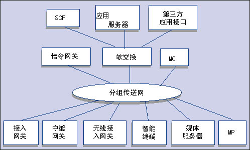 接入層包括各種接入網(wǎng)關(guān)、中繼網(wǎng)關(guān)、無線接入網(wǎng)關(guān)、智能終端以及與處理媒體有關(guān)的媒體服務(wù)器和多點處理器(MP)。傳送層包括提供IP包轉(zhuǎn)發(fā)的各種承載網(wǎng)功能實體。控制層是NGN網(wǎng)絡(luò)的核心,主要包括軟交換設(shè)備、信令網(wǎng)關(guān)和多點處理器。業(yè)務(wù)層則主要包括應用服務(wù)器、第三方應用接口和傳統(tǒng)智能網(wǎng)功能。該業(yè)務(wù)層通過開放的業(yè)務(wù)層接口向用戶提供傳統(tǒng)智能網(wǎng)業(yè)務(wù)、多樣化的第三方業(yè)務(wù)和增值業(yè)務(wù)。