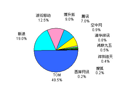從國內(nèi)移動IVR市場第一季度各SP的收入情況看,一季度收入超過千萬的只有TOM和新浪。其中TOM平均月收入超過1000萬;新浪平均月收入在480萬左右。從市場份額來看,TOM遙遙領(lǐng)先,接近50%的市場份額;其次是新浪,占到19%的市場份額。滾石移動和博升拓是最早進(jìn)入移動IVR市場的SP之一,市場份額分別為12.5%和9%左右;騰訊由于其特殊的用戶資源,雖然進(jìn)入移動IVR市場的時間相對稍晚一點,但業(yè)務(wù)增長很快,市場份額在7%左右。通過對各SP移動IVR市場份額的分析可以看出,目前移動IVR業(yè)務(wù)的市場集中度相對較高,以上這五家SP占到總市場份額的97%左右。