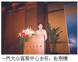 一汽大眾客服中心主任趙荊璞由于其在客戶服務(wù)方面的杰出貢獻(xiàn)被評(píng)為"2005中國最佳呼叫中心管理人",并作為獲獎(jiǎng)代表在大會(huì)上發(fā)了言。?