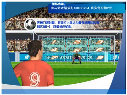 《單挑足球射門(mén)II》是我公司根據(jù)世界杯的一些特點(diǎn)、特色重新開(kāi)發(fā)的一款實(shí)時(shí)游戲。由電視臺(tái)、網(wǎng)站與電信運(yùn)營(yíng)商聯(lián)合經(jīng)營(yíng)的電信增值業(yè)務(wù),由電視臺(tái)提供頻道向電視觀眾播出游戲畫(huà)面(含圖像和聲音),電信運(yùn)營(yíng)商提供電話(huà)線路和短信通道,參與者通過(guò)固定電話(huà)、小靈通和手機(jī)參與游戲,運(yùn)營(yíng)方通過(guò)收取固定電話(huà)、小靈通和手機(jī)的信息費(fèi)實(shí)現(xiàn)盈利。