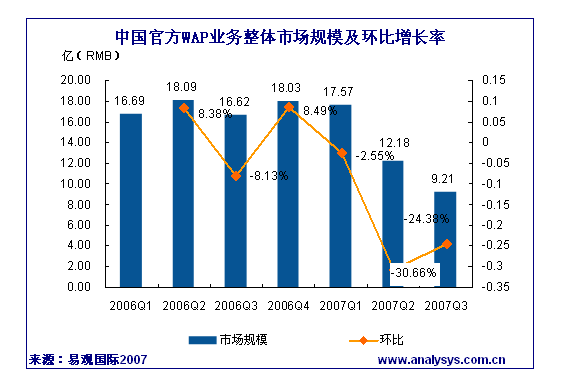 易觀國際研究表明,2007年第3季度中國官方WAP市場規(guī)模達(dá)到9.21億人民幣,同比下降44.57%。中國移動WAP頁面“資費提醒”政策對市場的影響已得到控制,與2季度WAP市場規(guī)模逐月遞減現(xiàn)象相比,2007年7月、8月、9月WAP市場規(guī)模呈現(xiàn)穩(wěn)步增長趨勢。中國聯(lián)通WAP市場規(guī)模為1.065億元,同比下降47.55%,自中國聯(lián)通四月份改實收結(jié)算后,信息費一直呈現(xiàn)下降趨勢。