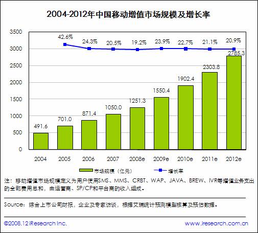 根據(jù)iResearch艾瑞咨詢(xún)即將推出的《2008-2009年中國(guó)移動(dòng)互聯(lián)網(wǎng)行業(yè)發(fā)展報(bào)告》統(tǒng)計(jì),2008年中國(guó)移動(dòng)增值市場(chǎng)規(guī)模達(dá)1251.3億人民幣(約合183.2億美元),相比2007年的1050億人民幣年同比僅增長(zhǎng)19.2%,相比2007年增速放緩。(中國(guó)移動(dòng)增值市場(chǎng)規(guī)模定義為用戶為各項(xiàng)移動(dòng)增值業(yè)務(wù)付費(fèi)總和)