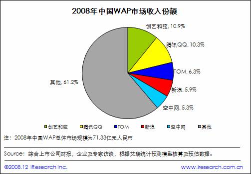 艾瑞咨詢(xún)研究發(fā)現(xiàn),08年WAP市場(chǎng)集中度較2007年有所提升,TOP5廠商占據(jù)份額已達(dá)38.8%,其中創(chuàng)意和弦、騰訊QQ、TOM分別以10.9%、10.3%和6.3%的比例位居前三。
