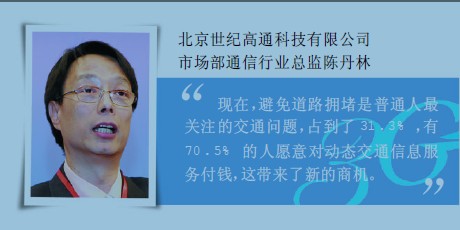 在北京世紀(jì)高通科技有限公司市場(chǎng)部通信行業(yè)總監(jiān)陳丹林看來(lái),交通堵塞已經(jīng)成為現(xiàn)代都市的頑疾,而3G的到來(lái)給這一問(wèn)題的解決帶來(lái)了新的思路。