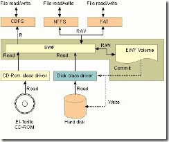 EWF能夠使操作系統(tǒng)可以從只讀媒體(如 CD ROM、寫保護硬盤或閃存)中啟動。所有對受到 EWF保護的卷進(jìn)行的寫入都被重定向到覆蓋。這些寫入被緩存在覆蓋中并且作為卷的一部分提供。這會產(chǎn)生該卷可寫的表象。覆蓋可能存在于磁盤或隨機訪問內(nèi)存 (RAM) 中。如果需要,可以將覆蓋中存儲的數(shù)據(jù)提交給受保護的卷。