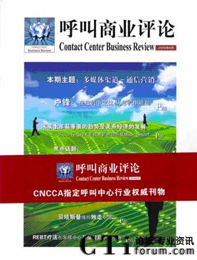 《呼叫商業(yè)評論》(Contact Center Business Review )是一本服務(wù)于呼叫中心行業(yè)企業(yè)高管人群的高端雜志,是CNCCA呼叫中心及客戶關(guān)系管理協(xié)會(huì)指定呼叫中心行業(yè)權(quán)威刊物,可作為高端客戶群體的行業(yè)指南,洞悉行業(yè)新舉措,法規(guī)新動(dòng)態(tài)的風(fēng)向標(biāo)。
