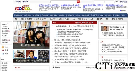 CTI論壇(ctiforum)1月11日消息(記者 張塵):近日,記者獲悉,原天極傳媒集團副總裁、資深媒體人士范鋒正式宣布創(chuàng)業(yè),同時,其所創(chuàng)辦的Web2.0媒體速途網(wǎng)(www.sootoo.com)于今日正式上線。在經(jīng)過近9個月的低調(diào)測試之后,定位于“中國互聯(lián)網(wǎng)行業(yè)媒體和在線服務(wù)平臺”的速途網(wǎng)今天以全新版式亮相。
