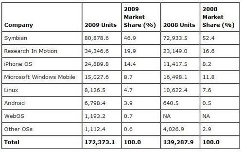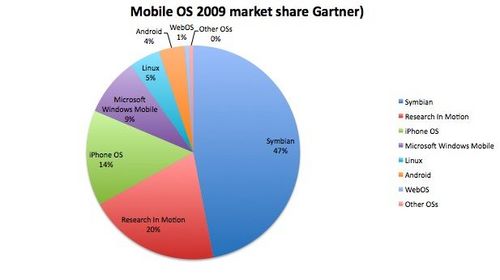 根據(jù)Gartner的數(shù)據(jù)顯示,去年共銷售出的智能手機達1.72億部,比前年上漲了24%,然而全世界手機的銷售總量卻并無起色(2008年為12.2億部,而2009年為12.1億部。在去年銷售的所有手機中,智能手機占14%,較2008(11%)年有所提升。iPhone盡管去年漲勢迅猛,只占去年各種手機銷售總量的2%。