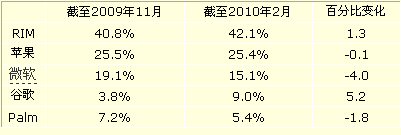 以下為各大智能手機(jī)平臺截至2009年11月的三個月平均市場份額與截至2010年2月的三個月平均市場份額對比: