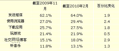 以下為各類移動內(nèi)容截至2009年11月的三個月平均使用比例與截至2010年2月的三個月平均使用比例對比: