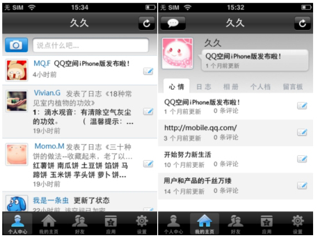 QQ空間foriPhone的外觀界面完全繼承了iPhone上應用軟件的清新簡潔風格,軟件主界面包括個人中心、我的主頁、好友、應用、設置五大功能。點擊個人中心可以看到自己的狀態(tài)、簽名以及好友的最新動態(tài)。并且可以直接使用置頂?shù)呐恼真I拍照,即時拍照上傳至空間,使用置頂?shù)男那檩斎肟蛴涗涀约旱男那椤?br />