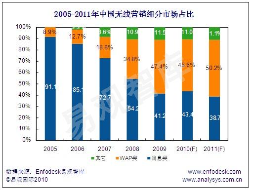 根據(jù)Enfodesk易觀智庫近期發(fā)布《中國無線營銷市場(chǎng)專題報(bào)告2010》顯示, 2009年中國無線營銷市場(chǎng)WAP類廣告在無線營銷整體占比達(dá)47.4%,其規(guī)模同比增長76.8%,與消息類廣告同比下跌1.3%相比WAP類廣告,已成為無線營銷市場(chǎng)最大推動(dòng)力量。