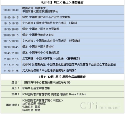 CTI論壇(ctiforum)8月3日消息(記者 潘婷婷):“第八屆中國(guó)呼叫中心產(chǎn)業(yè)高峰論壇暨第八屆中國(guó)最佳呼叫中心及最佳管理人頒獎(jiǎng)大會(huì)”定于2010年8月10日在上海國(guó)際貴都大飯店召開(kāi)。此次大會(huì)是由中國(guó)信息化推進(jìn)聯(lián)盟客戶(hù)關(guān)系管理專(zhuān)業(yè)委員會(huì)主辦,ICMI國(guó)際客戶(hù)管理學(xué)院(中國(guó)區(qū))承辦。通過(guò)本次大會(huì),與會(huì)者將獲得中國(guó)最佳呼叫中心實(shí)踐經(jīng)驗(yàn)和最佳解決方案的分享,與業(yè)界精英共話呼叫中心和客戶(hù)關(guān)系管理的未來(lái)。
