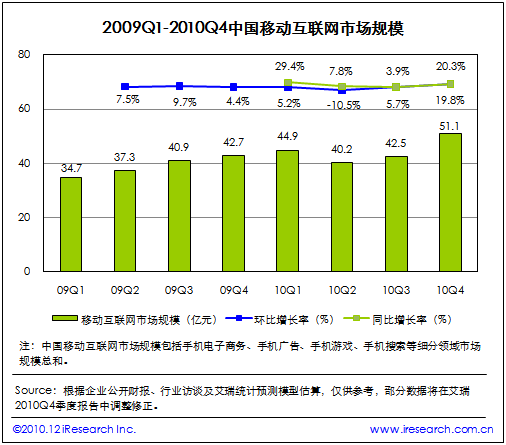 2010Q4中國(guó)移動(dòng)互聯(lián)網(wǎng)市場(chǎng)整體規(guī)模達(dá)到51.1億,同比增長(zhǎng)19.8%,環(huán)比增長(zhǎng)20.3%。艾瑞分析認(rèn)為,本季度電信管理局等政府行業(yè)管理部門和電信運(yùn)營(yíng)商對(duì)移動(dòng)增值市場(chǎng)治理行動(dòng)基本結(jié)束,移動(dòng)增值市場(chǎng)整體回升。同時(shí)手機(jī)電子商務(wù)市場(chǎng)繼續(xù)保持快速增長(zhǎng),移動(dòng)互聯(lián)網(wǎng)市場(chǎng)規(guī)模總體回升。