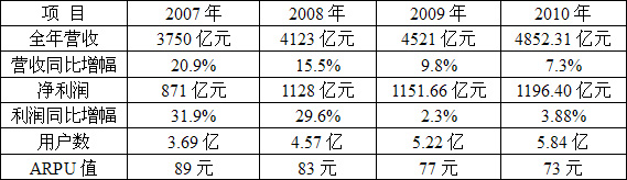 中國移動2007年-2010年年度業(yè)績對比