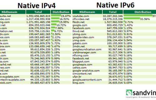 根據(jù)Sandvine的采樣數(shù)據(jù),YouTube服務(wù)貢獻(xiàn)了最多的IPv6流量,約為57%。緊接著是Netflix,流量貢獻(xiàn)約為32%。Facebook及其內(nèi)容分發(fā)網(wǎng)絡(luò)分別貢獻(xiàn)了1.15%和2.7%的流量,谷歌主頁則貢獻(xiàn)了1.42%的流量。(盧鑫)