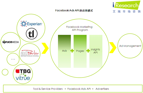 iResearch艾瑞咨詢整理Insidefacebook最新行業(yè)動態(tài)時發(fā)現,Facebook于2011年8月1日正式宣布開放廣告接口(Ads API)應用服務,通過在該接口上投放第三方的高效廣告管理工具,廣告主甚至可以保證數百萬的復雜媒體營銷計劃正常運營并實現廣告管理的高效優(yōu)化。到目前為止,Facebook只為少數有限的第三方廣告管理工具供應商提供了準入接口,包括Techlightenment(近日被Experian收購)、TBG Digital(與Vitrue達成協作)、Spruce Media、AdParlor等。此外,Facebook也建立了廣告接口營銷項目計劃,通過收取廣告、頁面、廣告接口洞察等相關費用來實現盈利。隨著更多的第三方工具與服務供應商進入Ads API市場,越來越多的當地小型廣告主也有望享受低成本的廣告優(yōu)化管理服務。
