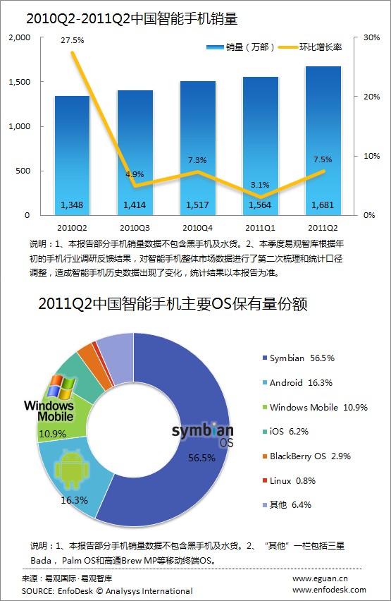 CTI論壇(ctiforum)4月29日消息(記者 潘婷婷):根據(jù)易觀智庫EnfoDesk近期發(fā)布數(shù)據(jù)顯示,中國智能手機市場2011年第2季度國內(nèi)銷售總量達1681萬部(不計黑手機和水貨手機),環(huán)比增長7.5%。