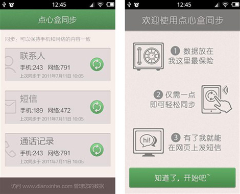 點(diǎn)心盒同步使用十分方便,在手機(jī)上安裝客戶(hù)端,通過(guò)注冊(cè)獲取賬號(hào),登陸后進(jìn)入軟件的主界面,僅需輕點(diǎn)同步按鈕,即可將聯(lián)系人、短信和通話記錄同步到點(diǎn)心盒網(wǎng)站上。此時(shí),不僅在手機(jī)端,用戶(hù)在云端通過(guò)點(diǎn)心盒網(wǎng)站也可以進(jìn)行聯(lián)系人新建、編輯和刪除的操作,并支持聯(lián)系人導(dǎo)入和去除重復(fù)的聯(lián)系人,方便聯(lián)系人管理。