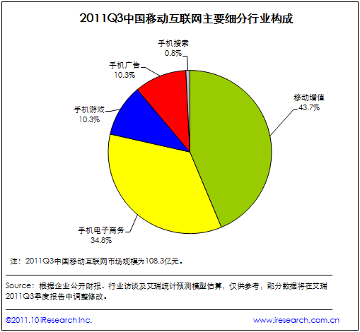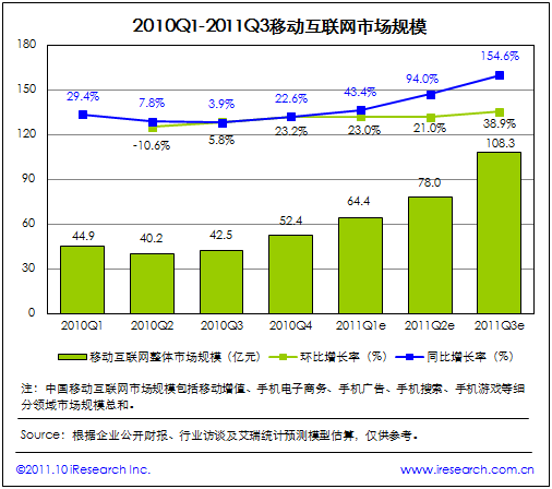 2011Q3中國移動(dòng)互聯(lián)網(wǎng)市場(chǎng)規(guī)模達(dá)108.3億元,爆發(fā)之勢(shì)初顯