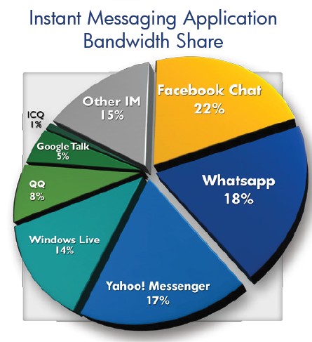 WhatsApp,跨平臺移動信息app發(fā)展很快,從2011年上半年的不到3%增長至11%。Yahoo信使,曾是近些年的主流即時通信應(yīng)用,下降明顯,從29%將至17%。QQ則有8%的流量份額。