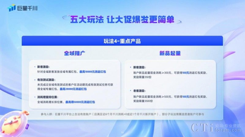 四、「重點產(chǎn)品玩法」:「全域推廣」和「新品起量」兩個巨量千川平臺重點產(chǎn)品,也推出了系列玩法。全域推廣對新客、完成有效測試的客戶發(fā)放全域推廣專屬紅包,最高達28888元,參與全域增長消耗排位賽也可獲得高達50000元的消返紅包。新品起量基準期新客現(xiàn)金消耗≥300元,可獲得100元消返紅包獎勵,老客現(xiàn)金消耗≥500元,即可得到100元消返紅包獎勵。