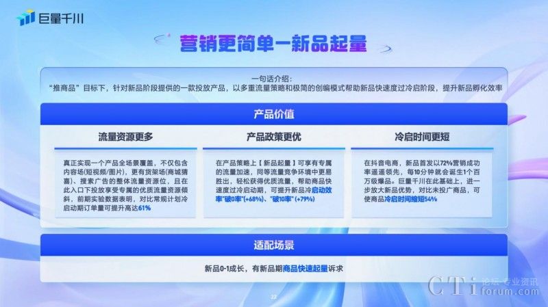 此外,商品全域推廣為商品推廣提供一站式解決方案,是以商品全域ROI為優(yōu)化目標,釋放全域流量帶來的增效價值,提供貨架場、內(nèi)容場增長雙引擎,幫助客戶在追求商品全域ROI達成的同時,最大化提升商品交易額,更好的滿足客戶的實際經(jīng)營目標。在商品全域推廣下,短視頻/商品卡/圖文體裁統(tǒng)一調(diào)控,無需糾結選擇推廣商品的投放工具,一站式全域流量觸達。