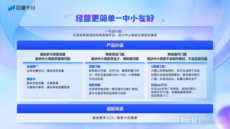 針對中小商家經(jīng)營長效問題,巨量千川打造簡單易用的電商營銷平臺。撬動多元場景流量,解決中小商家獲量難題;降低資金門檻,解決資金少、周轉難的問題;降低素材制作操作門檻,解決商家“不會投”、“不敢投”的難題,讓經(jīng)營更簡單。
