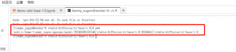 第二步,在終端頁(yè)面輸入“pwd”,查看并復(fù)制 stable-diffusion-xl-base-1.0 模型路徑。