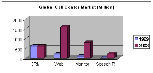 。。在1999年,全球呼叫中心應(yīng)用軟件的市場(chǎng)總值為29億美元,到2003年這一數(shù)字將增長(zhǎng)近三倍,達(dá)到85億美元。這一增長(zhǎng)主要來源于對(duì)基于互聯(lián)網(wǎng)呼叫應(yīng)用軟件以及呼叫監(jiān)控解決方案的需求。Data-monitor 市場(chǎng)分析專家在1999年針對(duì)呼叫中心軟件市場(chǎng)進(jìn)行調(diào)研,具體數(shù)字詳見下表: