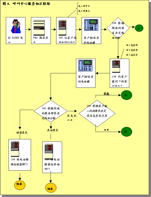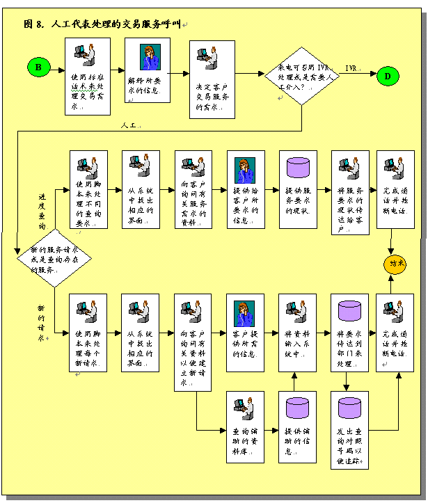 圖3概述了呼叫中心服務(wù)呼叫處理過(guò)程。描述了進(jìn)入呼叫中心系統(tǒng)的各種呼叫如何完成處理過(guò)程,或者由真人代表完成,或者是通過(guò)IVR技術(shù)完成。