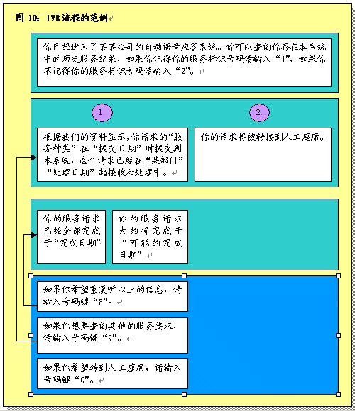 根據(jù)呼叫處理部分所作的說(shuō)明,在完成初次聯(lián)絡(luò)過(guò)程之后,服務(wù)代表將確定呼叫者的需要。之后服務(wù)代表將協(xié)助呼叫者或者使其選擇IVR系統(tǒng),該系統(tǒng)通過(guò)自動(dòng)為這些請(qǐng)求錄音提供相關(guān)的信息和服務(wù)。服務(wù)代表將接受培訓(xùn)識(shí)別哪些交易服務(wù)和信息服務(wù)可以通過(guò)IVR進(jìn)行,這樣他們可以使呼叫者選擇自我服務(wù)。圖9圖示了用這一辦法處理呼叫的過(guò)程。
