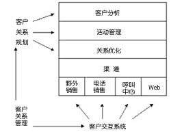 真正的CRM解決方案是一個復雜的聯合體,它由許多組件(即分析工具、活動管理與事件引發(fā)等)與許多需要用來達到一對一的營銷能力(如間接管理、基于規(guī)章制度的工作流管理以及真正的渠道管理等)的新組件共同組成。此外,在非客戶聯系系統(tǒng)(如企業(yè)資源規(guī)劃與操作)與客戶聯系系統(tǒng)之間必須有接口。最后,在企業(yè)內建立一套完整的便于知識管理的反饋循環(huán)系統(tǒng)也很必要。