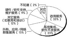 根據(jù)IT支出就可以推測(cè)購(gòu)買過程及其重點(diǎn)。平均而言,在被調(diào)查者的CRM支出中,29%用在硬件上,16%用在軟件上,38%用在內(nèi)部服務(wù)上,16%用在外部服務(wù)上。圖2顯示了用在外部服務(wù)上的IT支出,其中包括: