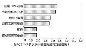 通常,通信提供商相對(duì)而言不愿意求助于專業(yè)服務(wù)公司來幫助其實(shí)施CRM解決方案。在1~5的標(biāo)尺中,只有積分為5的公司可能使用專業(yè)服務(wù)公司,分?jǐn)?shù)低于3.5的公司沒有一家會(huì)這么做,這表明通信提供商仍由內(nèi)部人員來實(shí)施多數(shù)功能。調(diào)查的分?jǐn)?shù)表明他們最可能與外部服務(wù)提供商合作制定戰(zhàn)略——定制軟件開發(fā)(3.33)和培訓(xùn)(3.22)。他們最不可能求助此類公司來從事網(wǎng)絡(luò)管理和集成(1.89)或營(yíng)銷(1.89)工作。圖3顯示的就是這些調(diào)查結(jié)果。