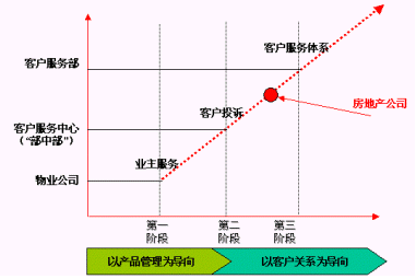 客戶服務(wù)的發(fā)展進(jìn)程,具體如下圖所示,目前國內(nèi)絕大多數(shù)房地產(chǎn)公司處于第二階段。