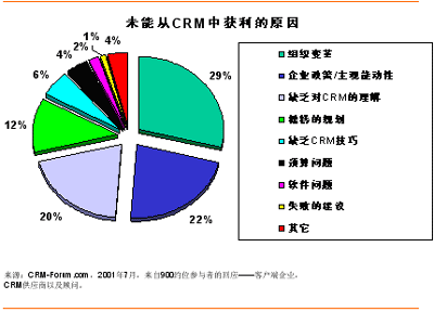 但成功只會(huì)擁抱那些能夠“正確執(zhí)行”的人,而不是任何一個(gè)搭上CRM順風(fēng)船的企業(yè)。2001年7月,CRM-Forum.com出版了一份關(guān)于未能從CRM中獲利原因的報(bào)告。從搜集到的來自CRM開拓者的約900個(gè)回應(yīng)來看——客戶端企業(yè),CRM供應(yīng)商以及顧問,組織變革及企業(yè)政策/主觀能動(dòng)性占了50%以上的失敗原因;緊隨其后的各個(gè)因素包括缺乏對(duì)CRM的理解(20%)和糟糕的規(guī)劃(12%)。下面讓我們就CRM方法論的選擇對(duì)這些因素作一番考察吧。