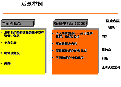 在評(píng)估當(dāng)前情況與遠(yuǎn)景,資源需求,癥結(jié),極限以及鋪就路標(biāo)和里程碑的關(guān)系時(shí),實(shí)施展望和差距分析會(huì)議是十分重要的。取決于你對(duì)CRM遠(yuǎn)景的定義——無論是它將成為一個(gè)能夠給你一把競(jìng)爭(zhēng)利刃的企業(yè)策略 (類似的例子有Citicorp,Dell,F(xiàn)ord Motors) 或僅僅只是一個(gè)讓你更出眾的營(yíng)銷項(xiàng)目——這邁出的第一步在你選擇CRM方法論的過程中都必將起到舉足輕重的作用。一個(gè)核心的方法論必須能夠支持企業(yè)大部分的業(yè)務(wù)和流程需求,如MIS;客戶體驗(yàn)管理;接觸點(diǎn)管理;收益率管理等等。