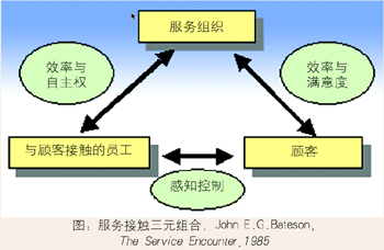 在Bateson的“三元組合”模型中,顧客通過“與顧客接觸的員工”感受到服務(wù)提供商提供的服務(wù),從而對服務(wù)組織的服務(wù)效率和滿意度做出自己的評價。這種情況下,顧客的“滿意”與“不滿”是通過“與顧客接觸的員工”獲得的,但服務(wù)感知同時反映了服務(wù)組織給予“與顧客接觸的員工”的自主權(quán)和“員工的接受程度”。