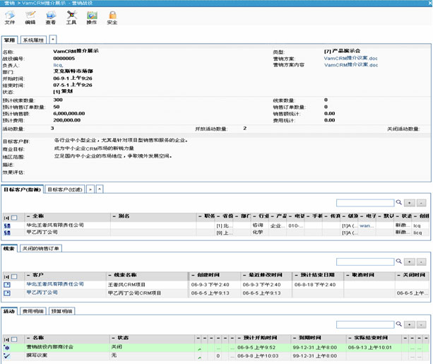 VamCRM的營銷戰(zhàn)役,可以自動統(tǒng)計(jì)有多少線索成功轉(zhuǎn)化為業(yè)務(wù)機(jī)會,有多少線索最終簽單,從而使得企業(yè)相關(guān)管理人員可以對營銷戰(zhàn)役的效果得到直觀的量化評估,對市場活動的投資收益做到心中有數(shù)。